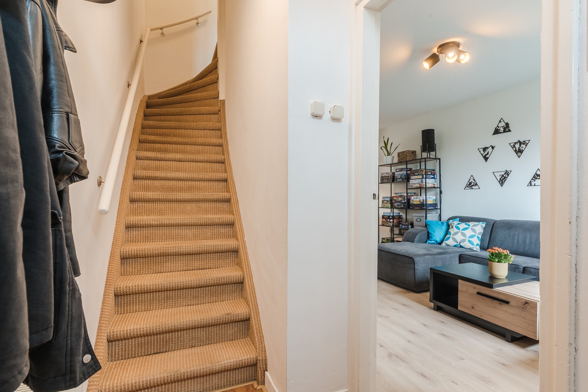 Via de hal met trapopgang bereik je de lichte doorzonwoonkamer, waar de grote ramen zorgen voor een prettige, open sfeer. Aan de achterzijde bevindt zich de halfopen keuken, voorzien van diverse inbouwapparatuur zoals een inductiekookplaat, afzuigkap, vaatwasser en koelkast. In de aanbouw is het toilet geplaatst.