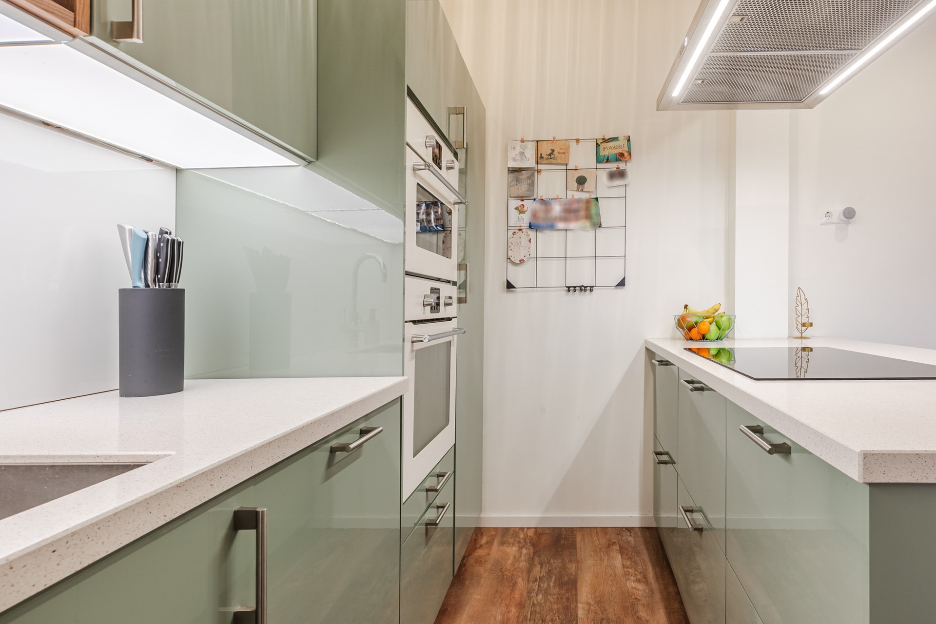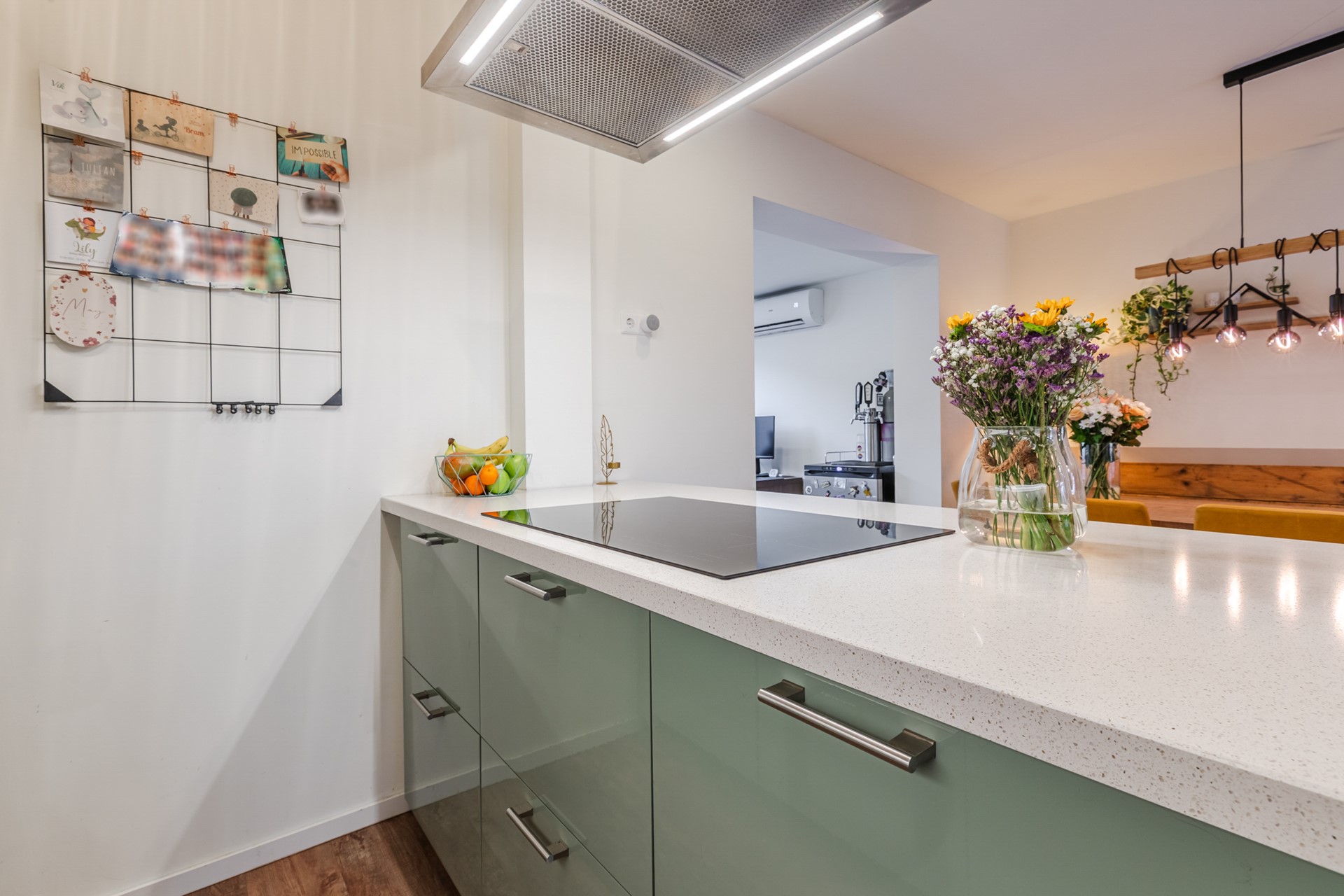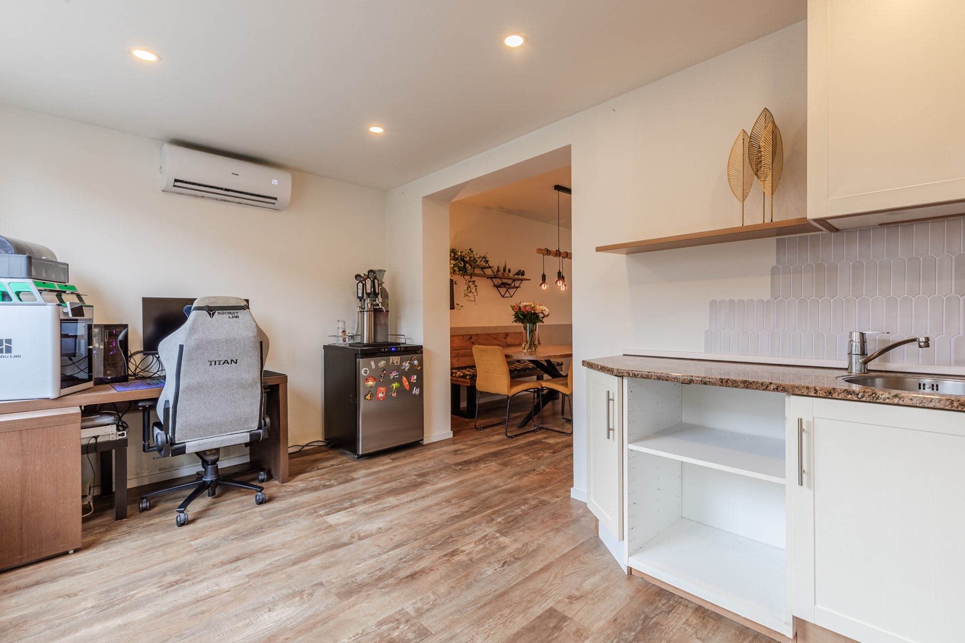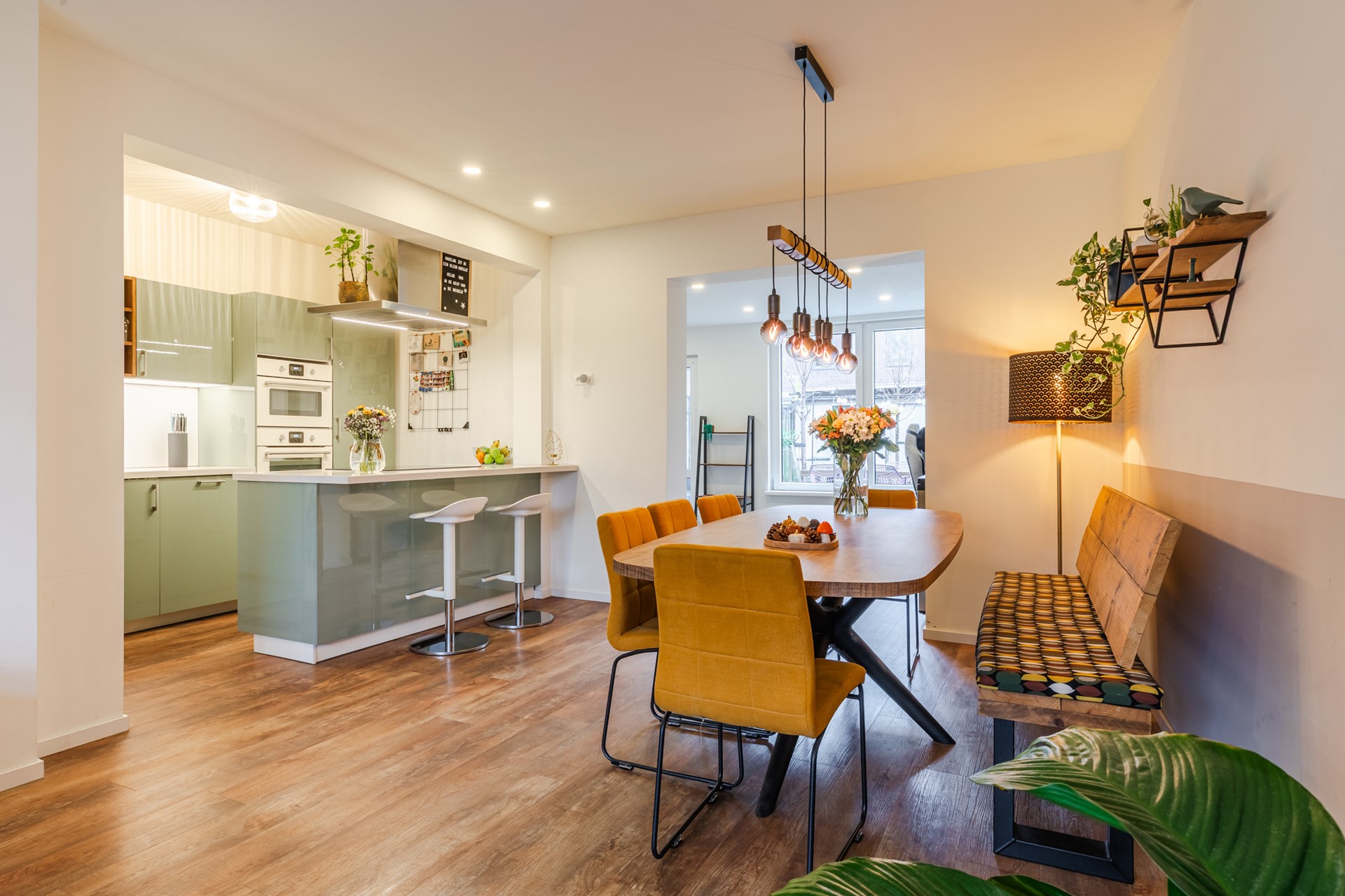 Aan de achterzijde ligt de halfopen keuken, voorzien van moderne inbouwapparatuur zoals een inductiekookplaat, afzuigkap, vaatwasser en koelkast.