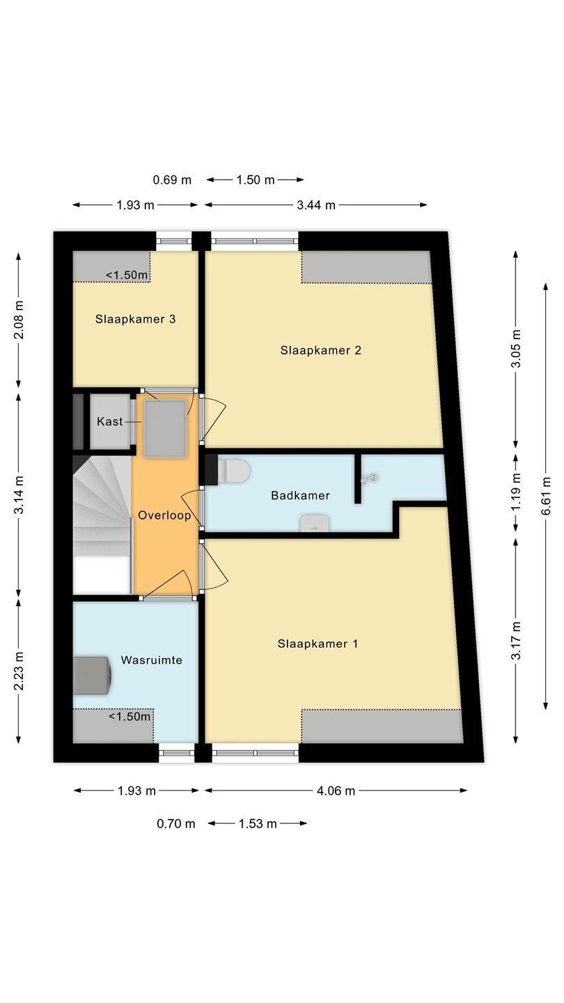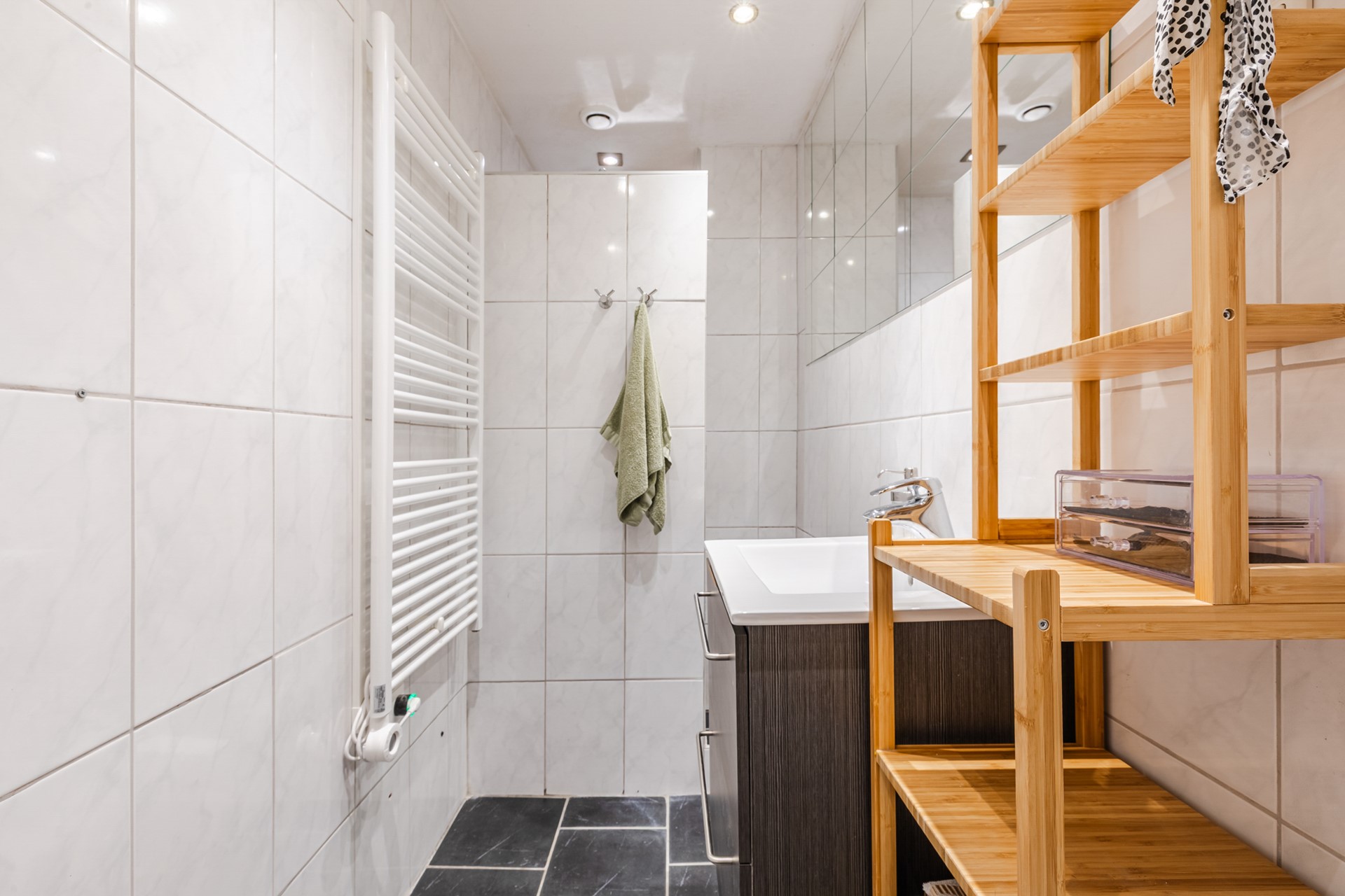De overloop met vaste kast geeft toegang tot maar liefst vier kamers. Drie hiervan zijn geschikt als slaapkamer, terwijl de vierde kamer momenteel is ingericht als wasruimte met aansluitingen voor wasapparatuur. De nette badkamer beschikt over een wastafel en een inloopdouche – een fijne plek om even tot rust te komen.