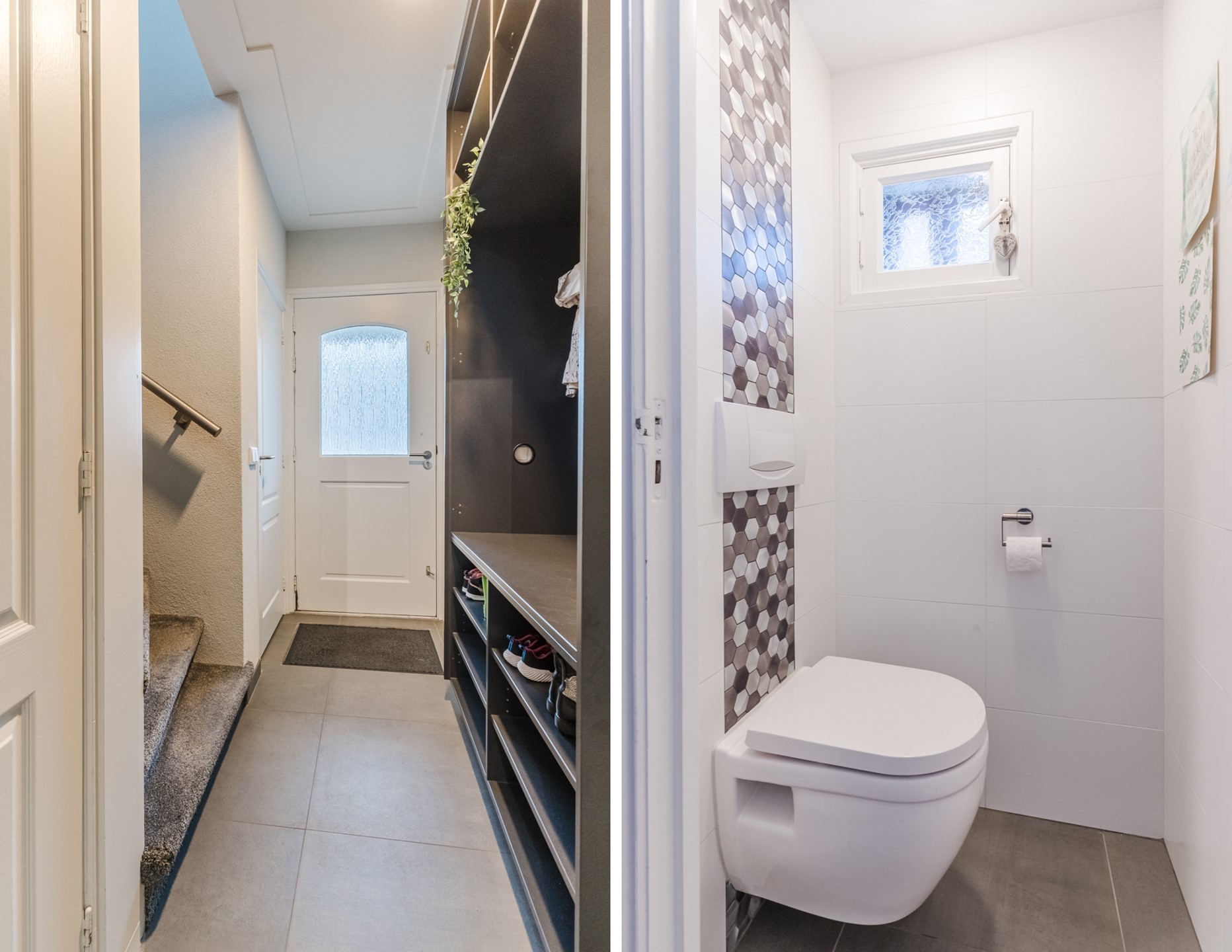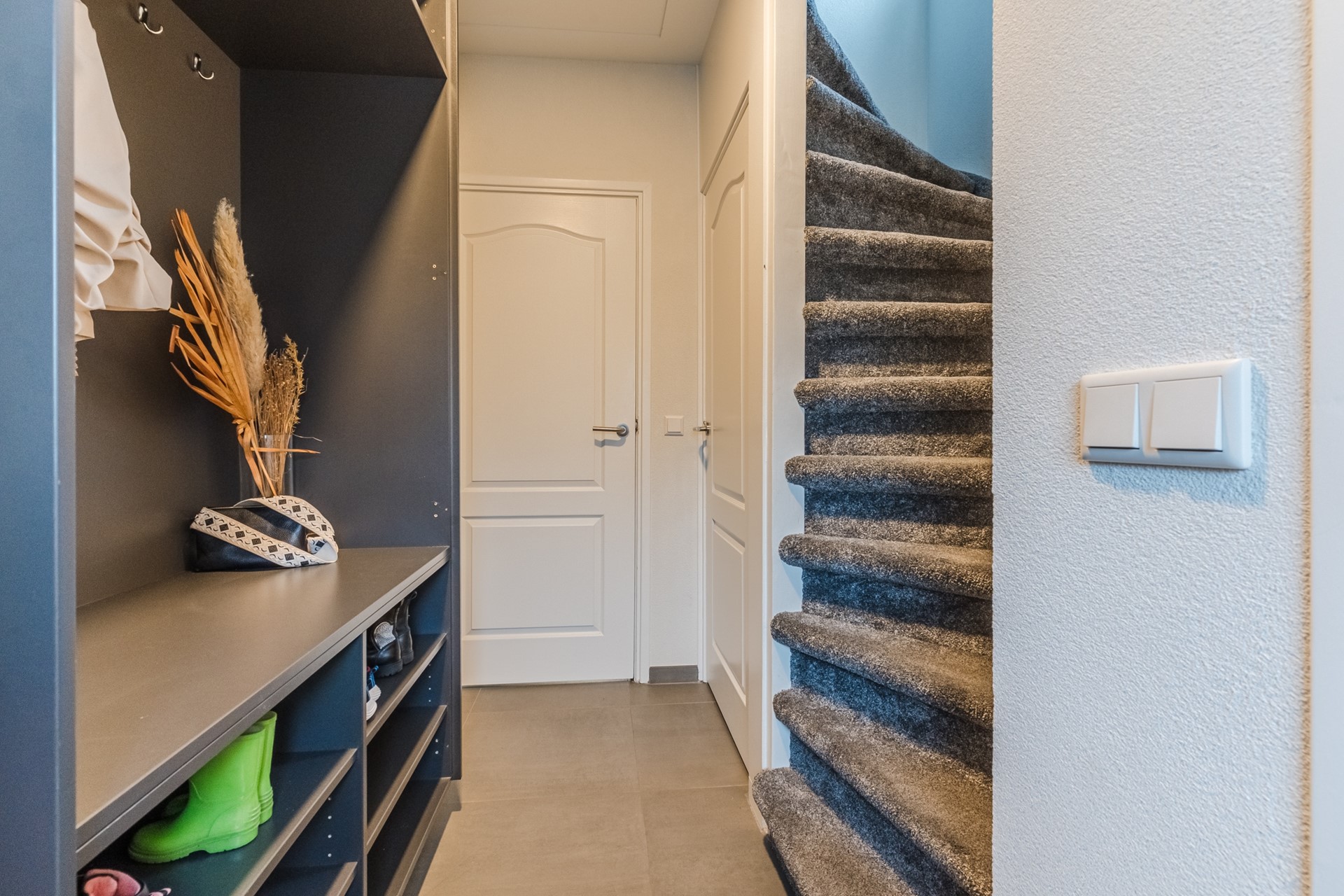 Je komt binnen in de hal, waar zich de kapstokkast, het toilet, de trapopgang en een handige voorraadkast bevinden. Vanuit de hal heb je toegang tot de keuken, die is uitgevoerd met een moderne rechte opstelling voorzien van een inductiekookplaat, combi-oven en vaatwasser.