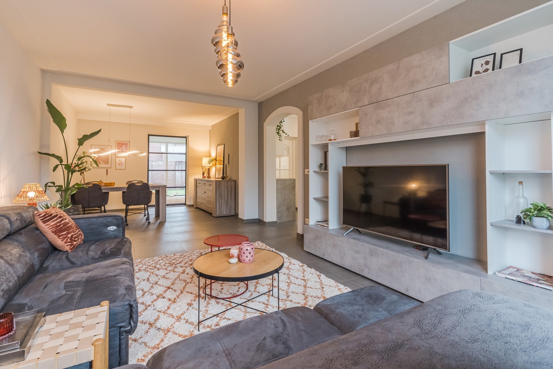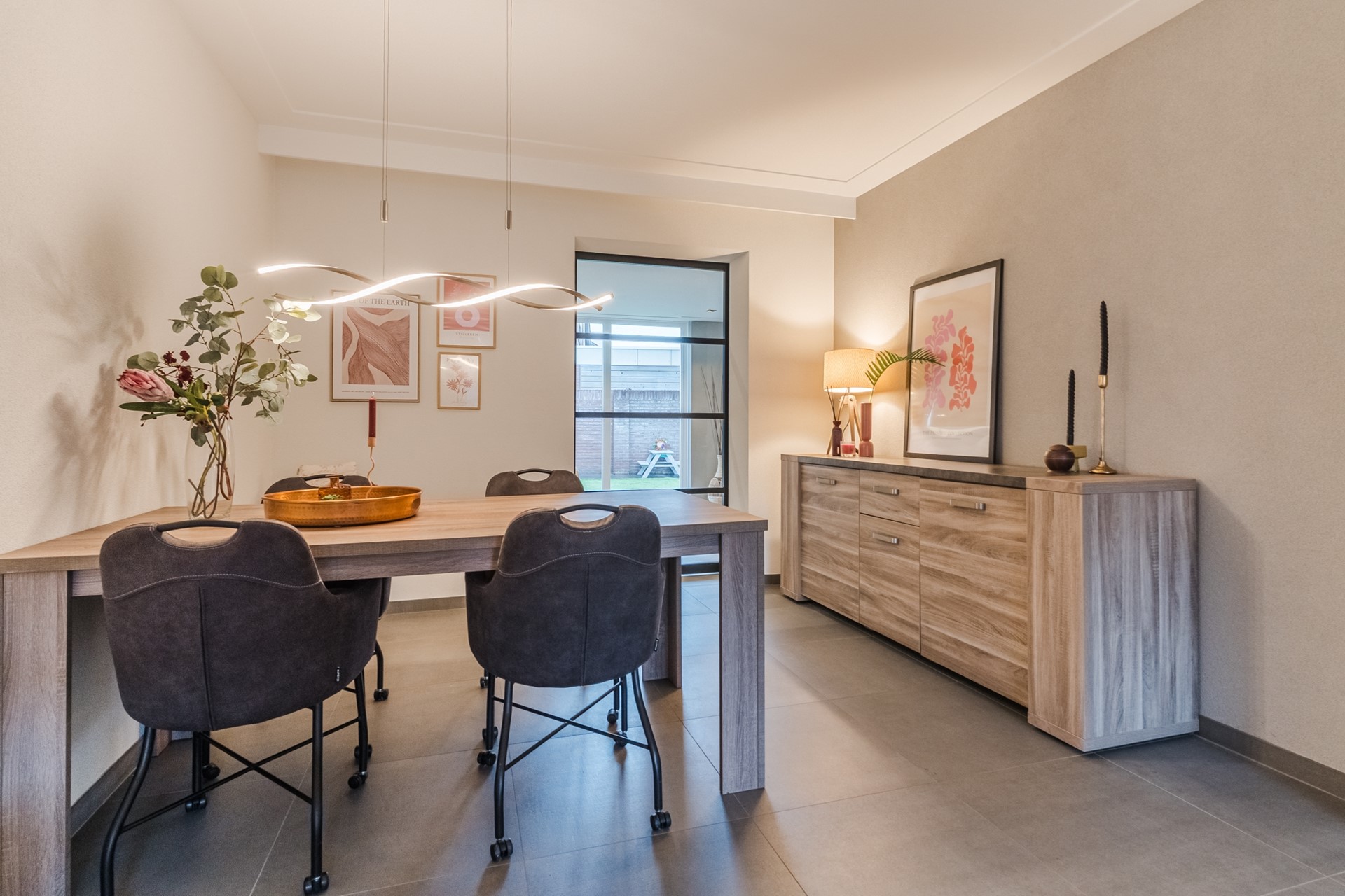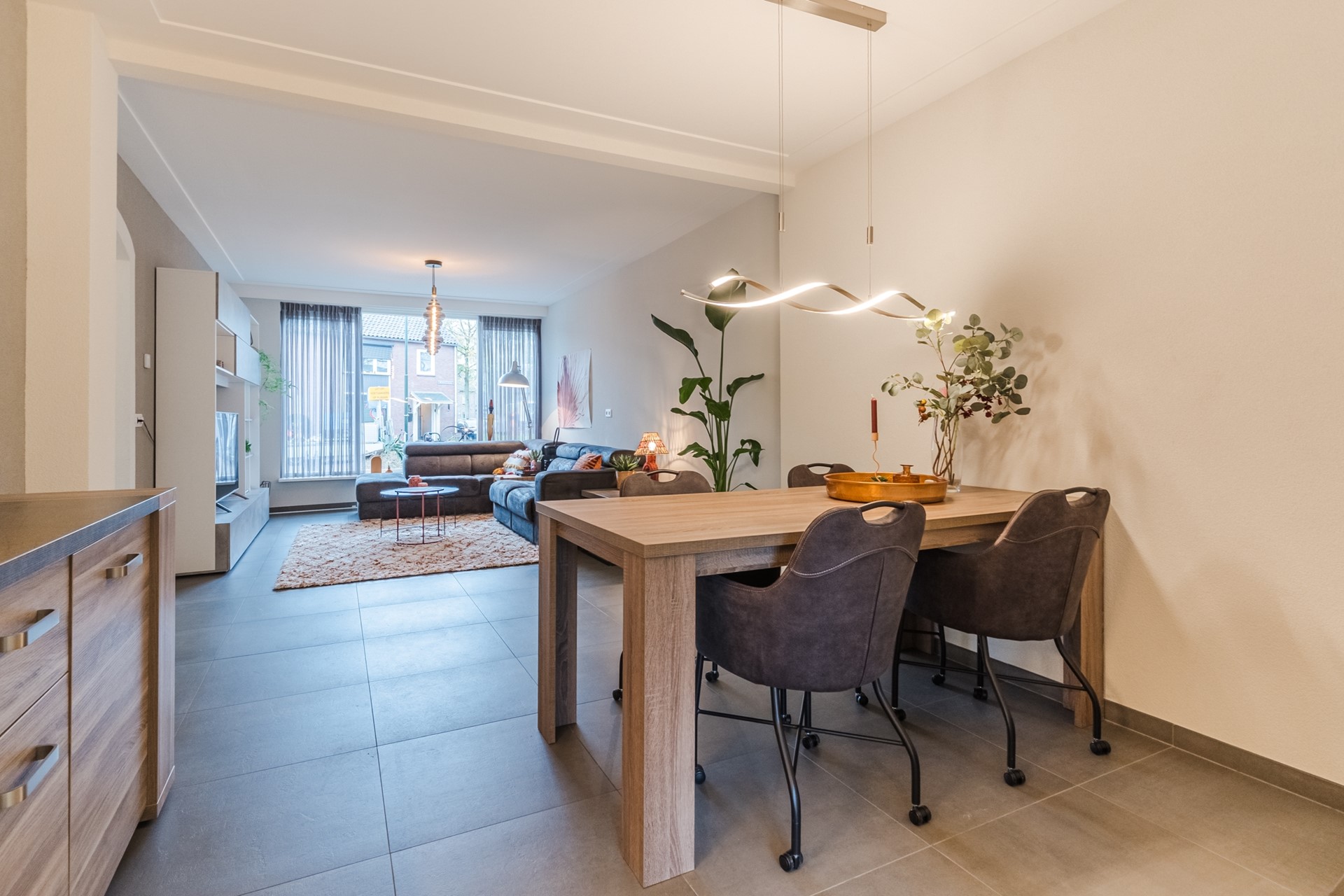 Aansluitend ligt de lichte woonkamer, met de zithoek aan de voorzijde en ruimte voor een eethoek richting de achterzijde. De gehele begane grond is voorzien van een tegelvloer met vloerverwarming, wat bijdraagt aan een prettig wooncomfort.