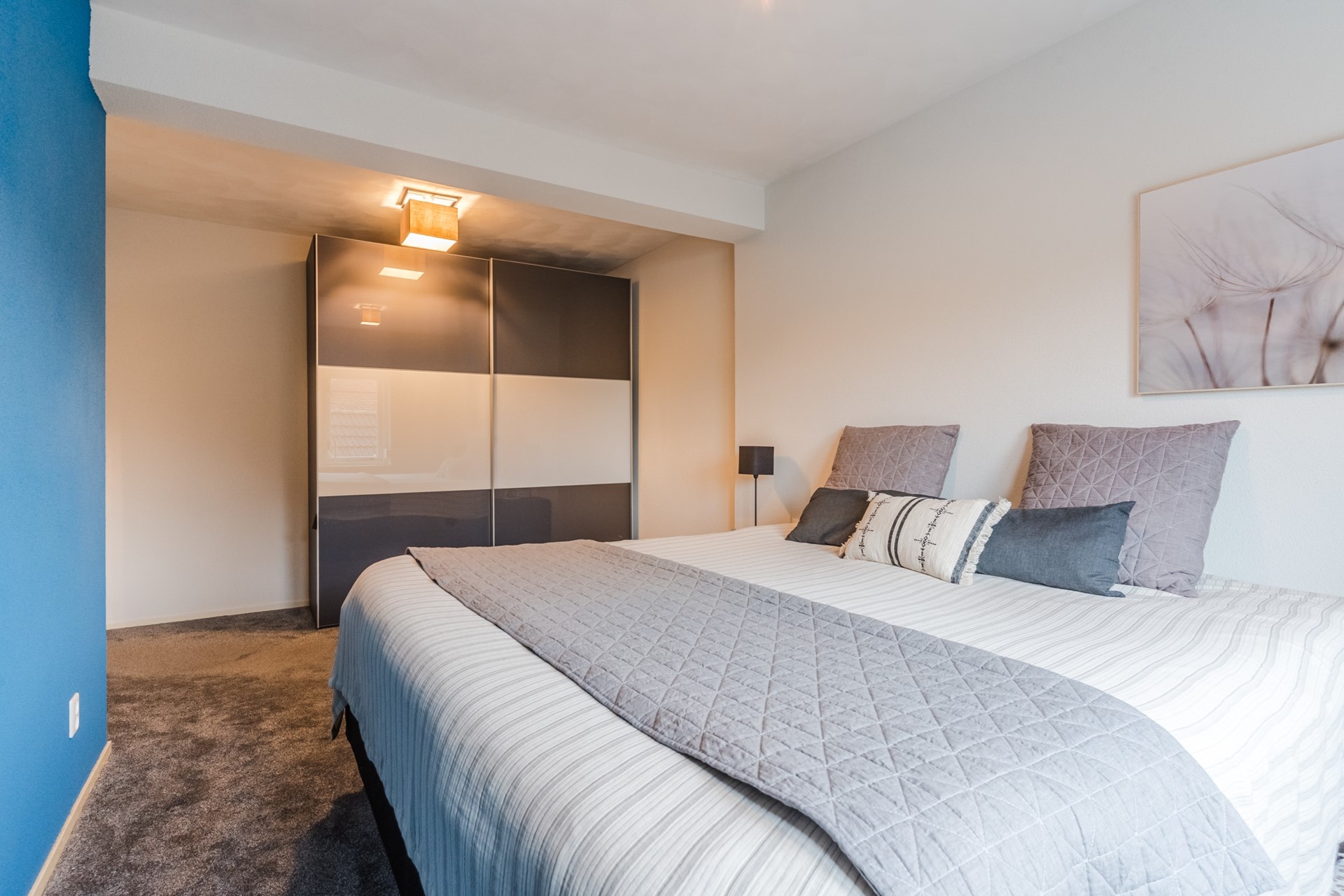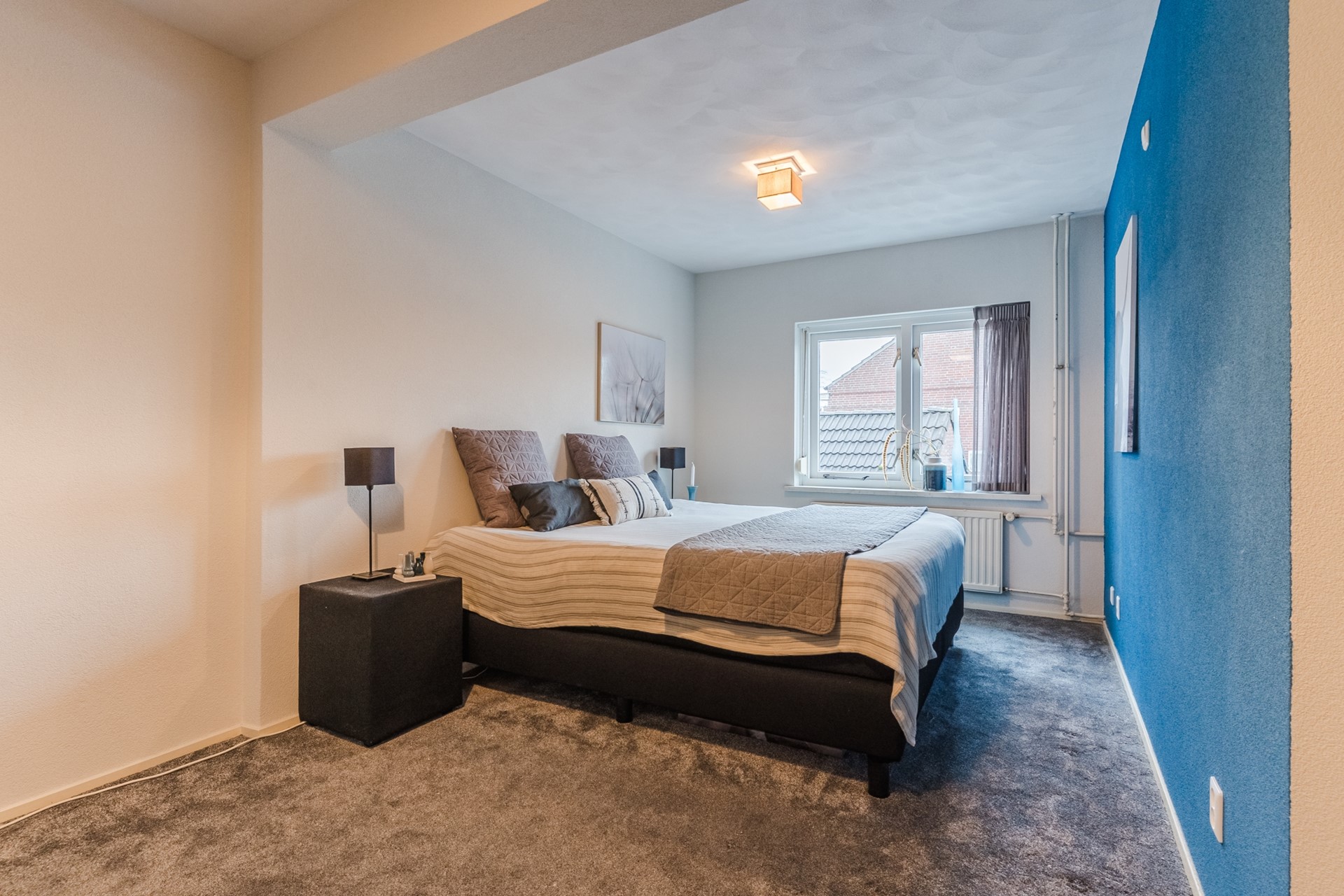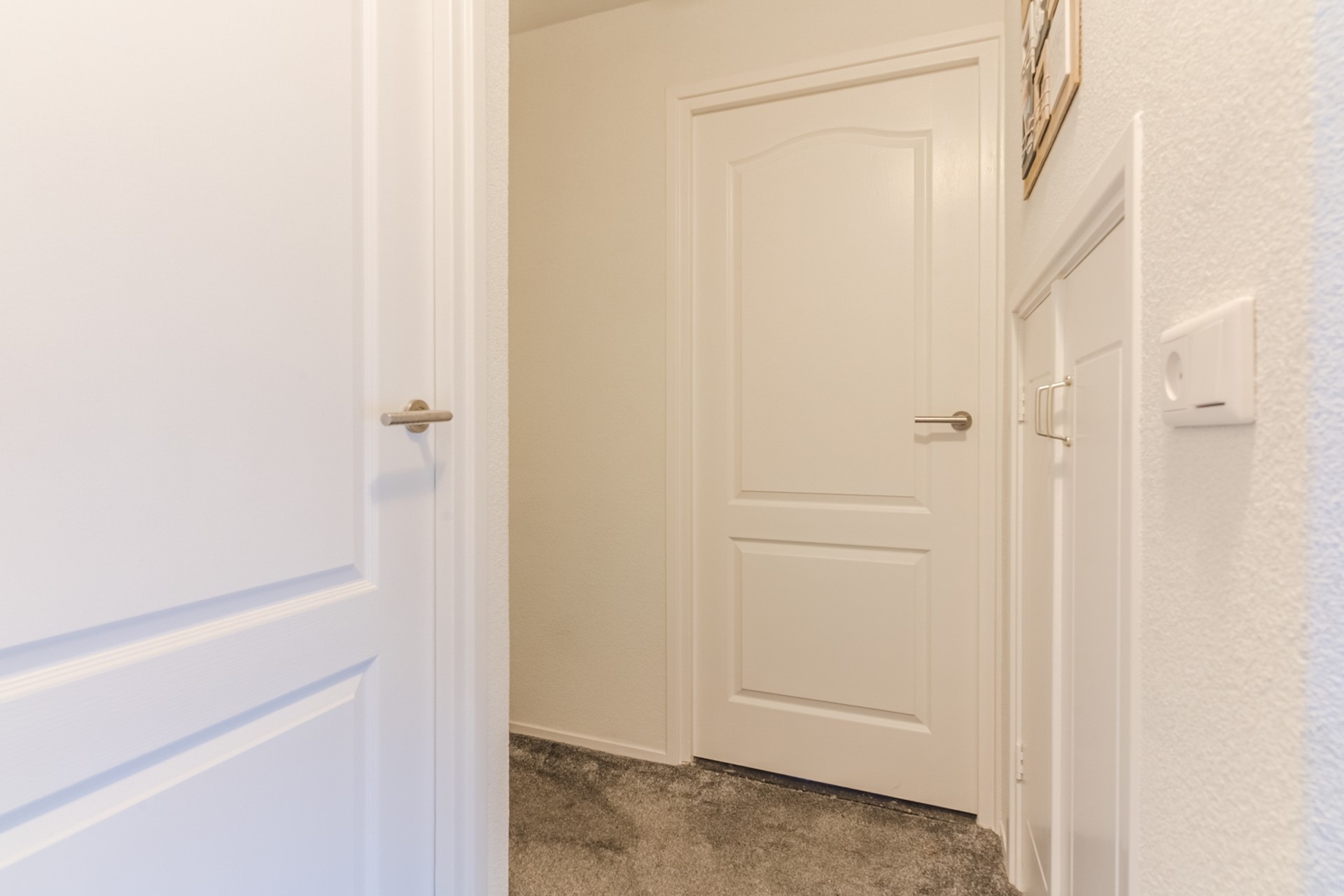 Op de eerste verdieping vind je drie verzorgde slaapkamers, alle afgewerkt met vloerbedekking. De overloop is uitgerust met een airco-unit, wat zorgt voor een comfortabel binnenklimaat.