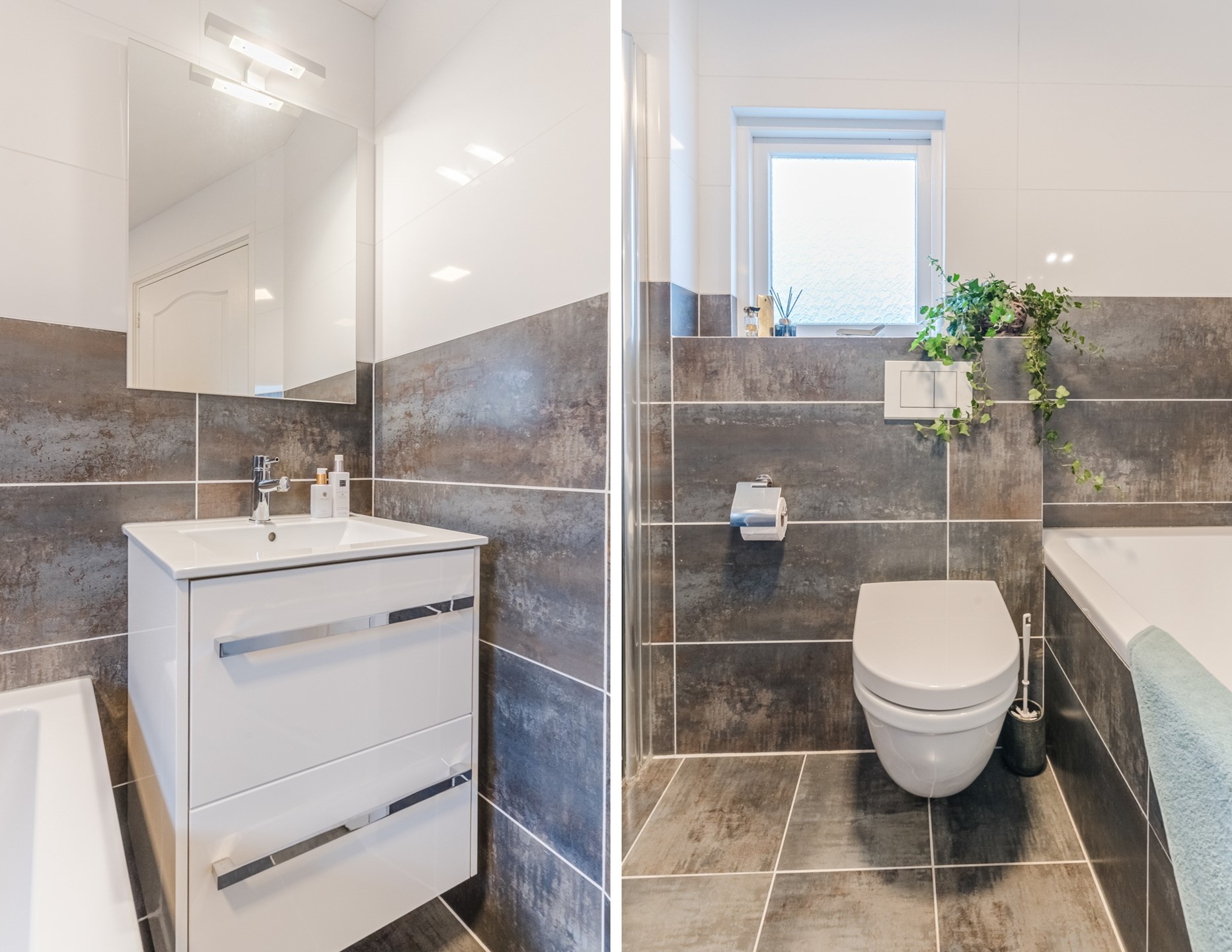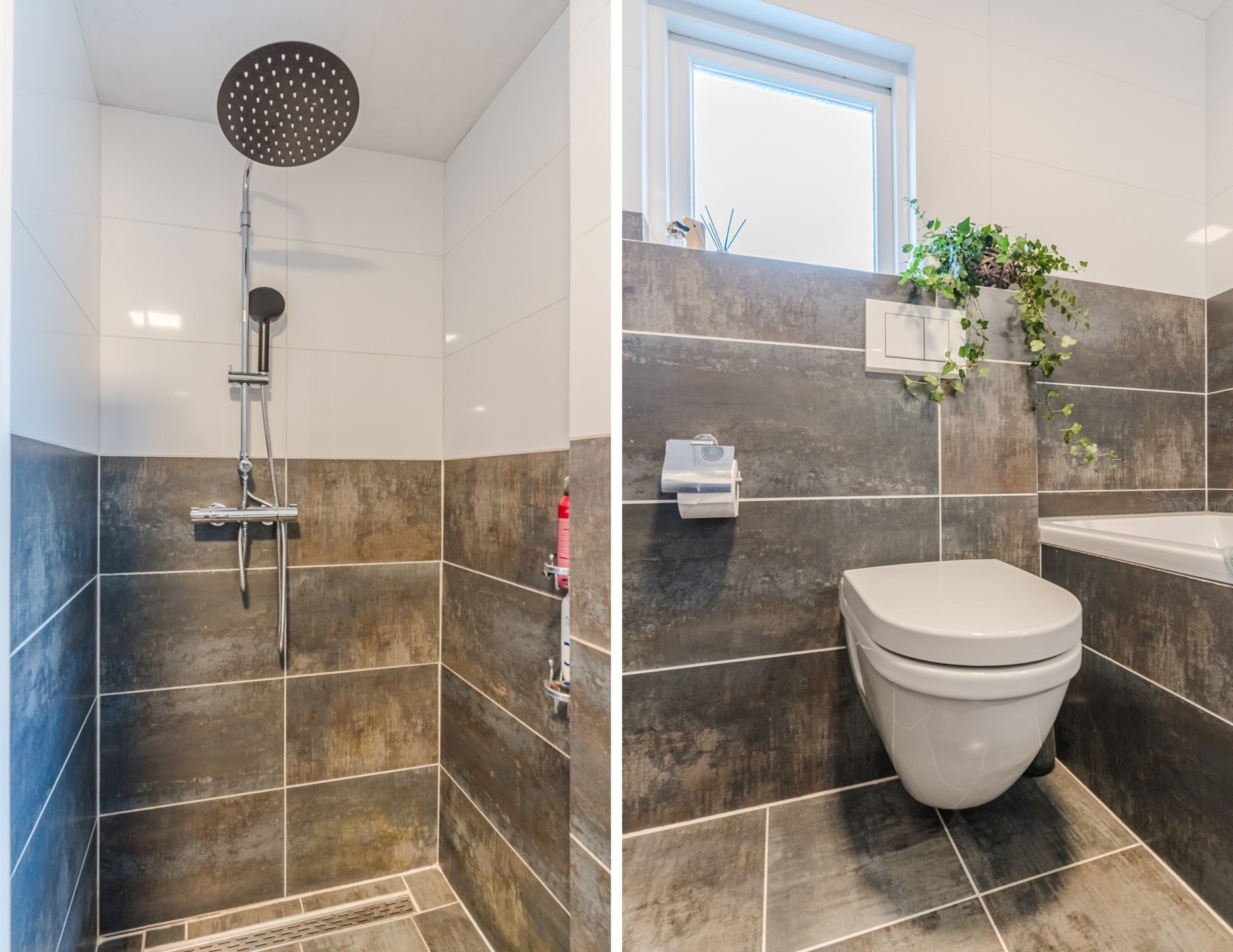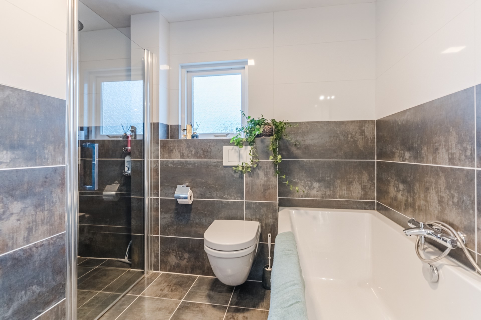 De moderne badkamer is compleet ingericht en voorzien van een ligbad, inloopdouche, tweede toilet en een wastafelmeubel. De afwerking is tijdloos en praktisch, met voldoende ruimte voor dagelijks gebruik.