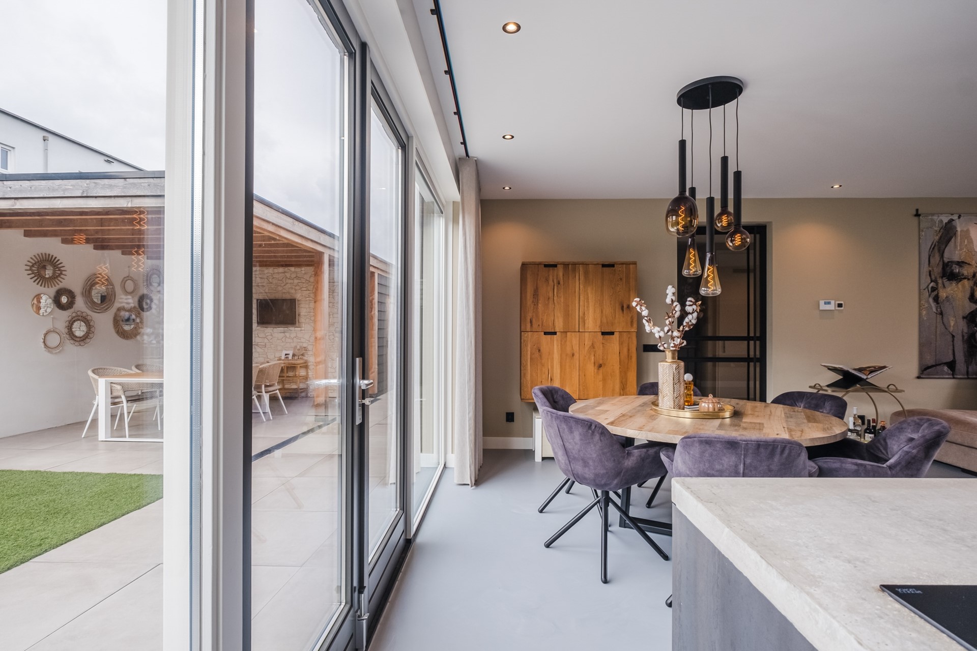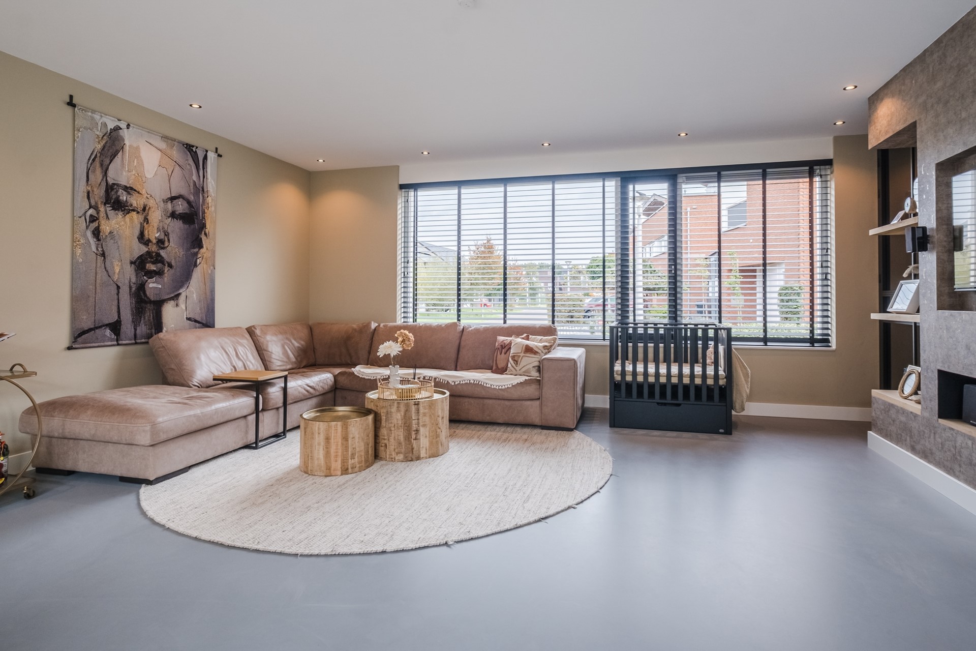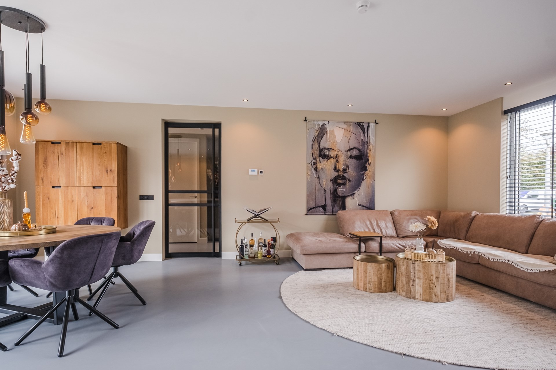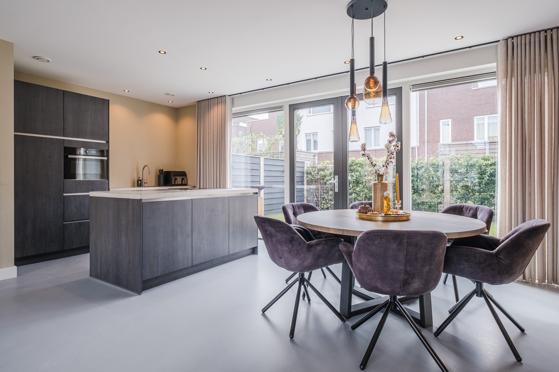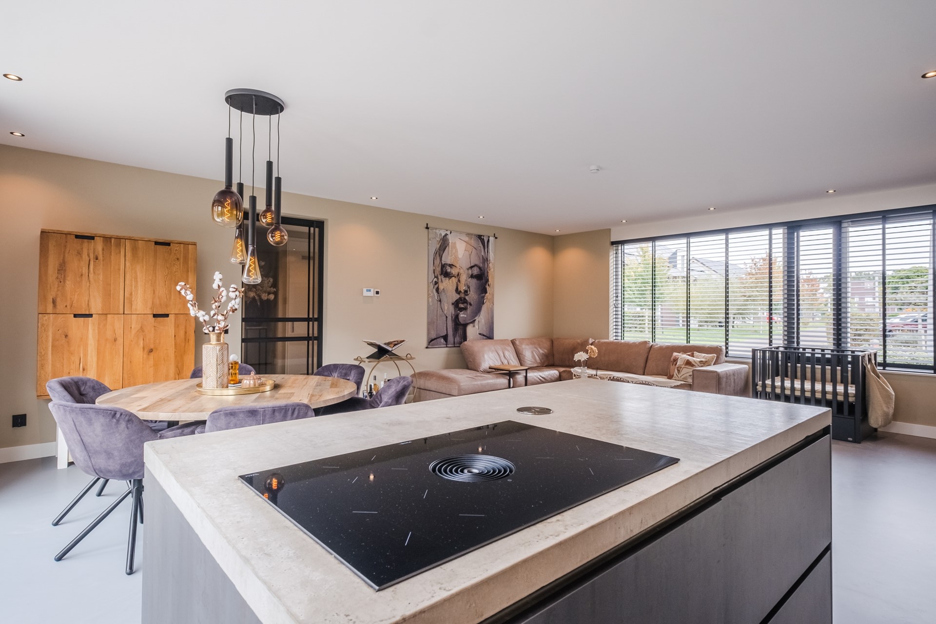 De ruime woonkamer is licht en sfeervol dankzij de grote raampartijen. De open keuken is voorzien van diverse kwalitatieve inbouwapparaten en vormt een fijne plek om te koken, te eten en samen te zijn. Vanuit de woonkamer bereik je een portaal met de trapopgang naar de eerste verdieping.