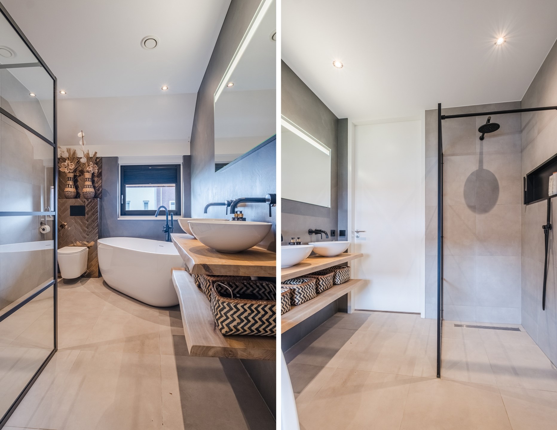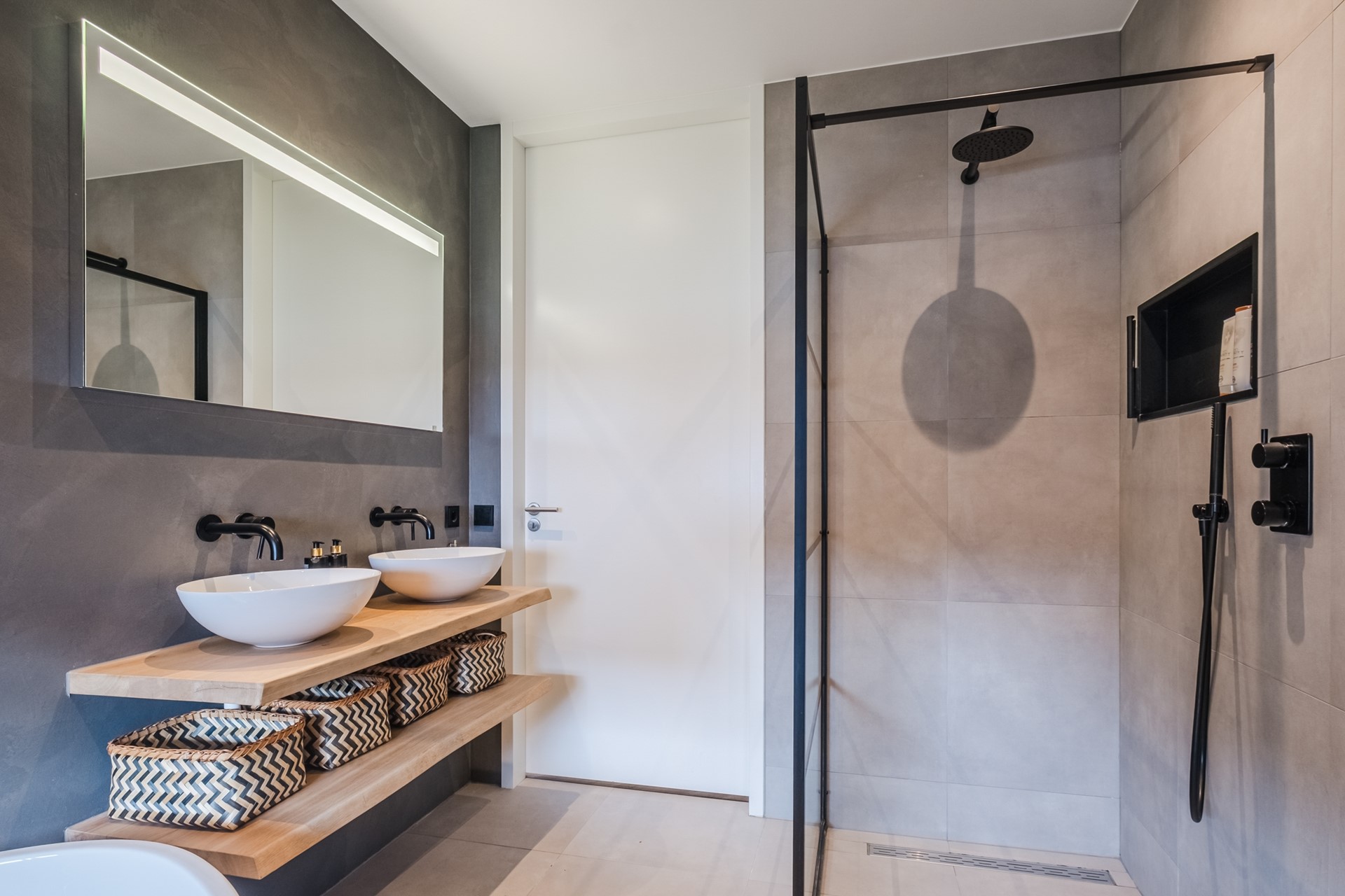 Op de eerste verdieping vind je drie ruime slaapkamers, allemaal strak afgewerkt. De badkamer is zeer luxe uitgevoerd met moderne materialen en een hoogwaardige afwerking.