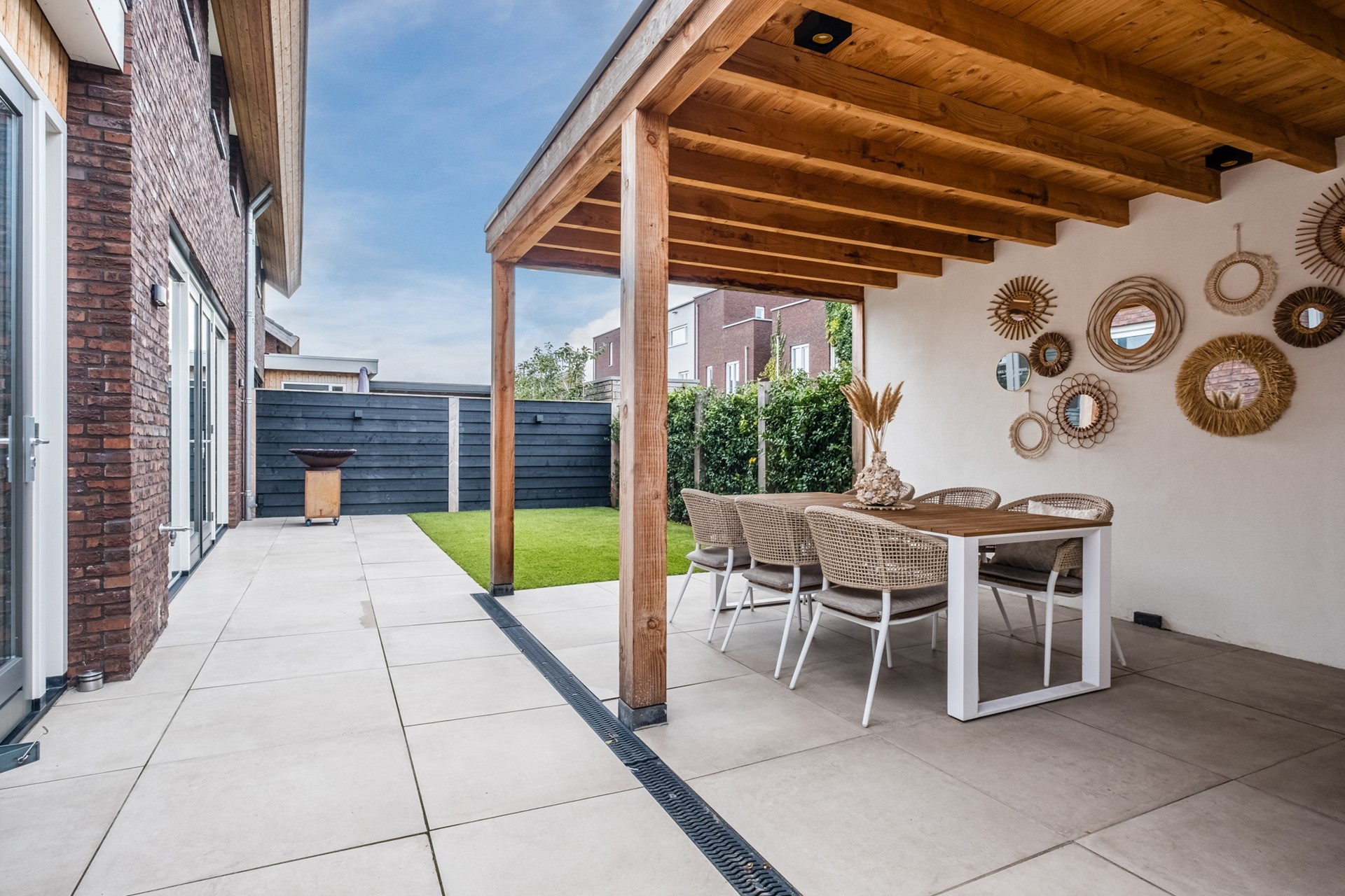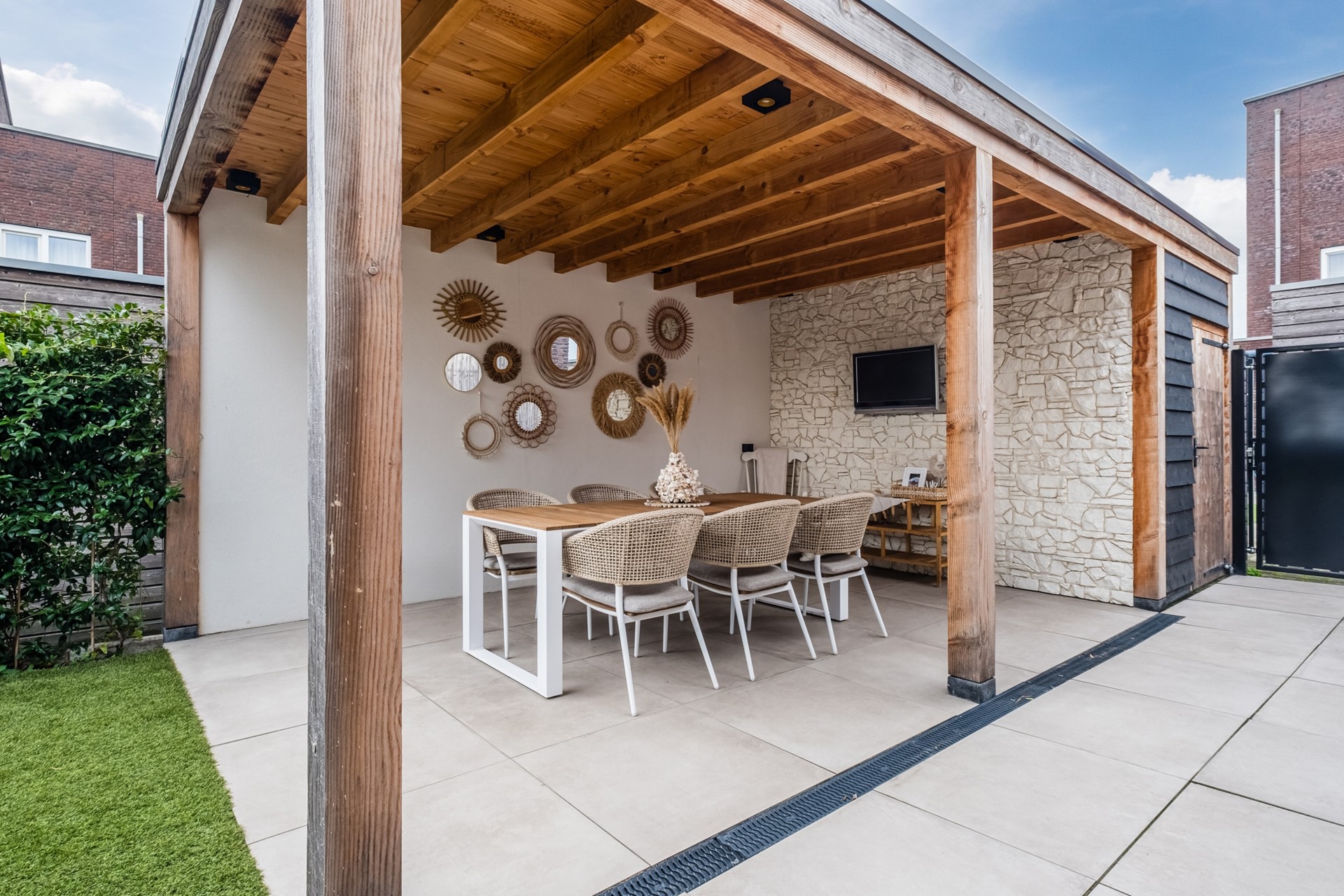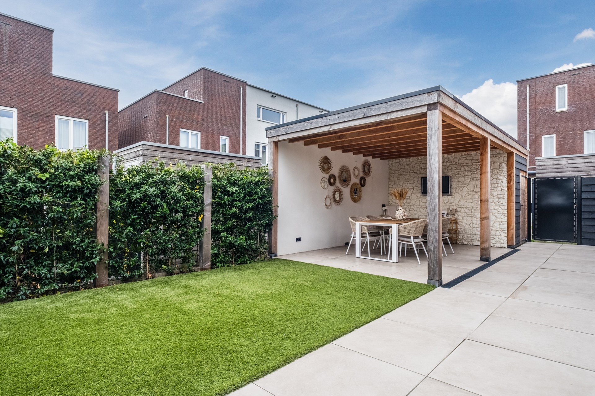 De achtertuin is onderhoudsvriendelijk aangelegd en voorzien van een luxe overkapping. Daarnaast is er een compacte berging aanwezig voor fietsen en/of tuingereedschap. De tuin is bovendien via twee achteringangen bereikbaar, wat zorgt voor extra gemak.