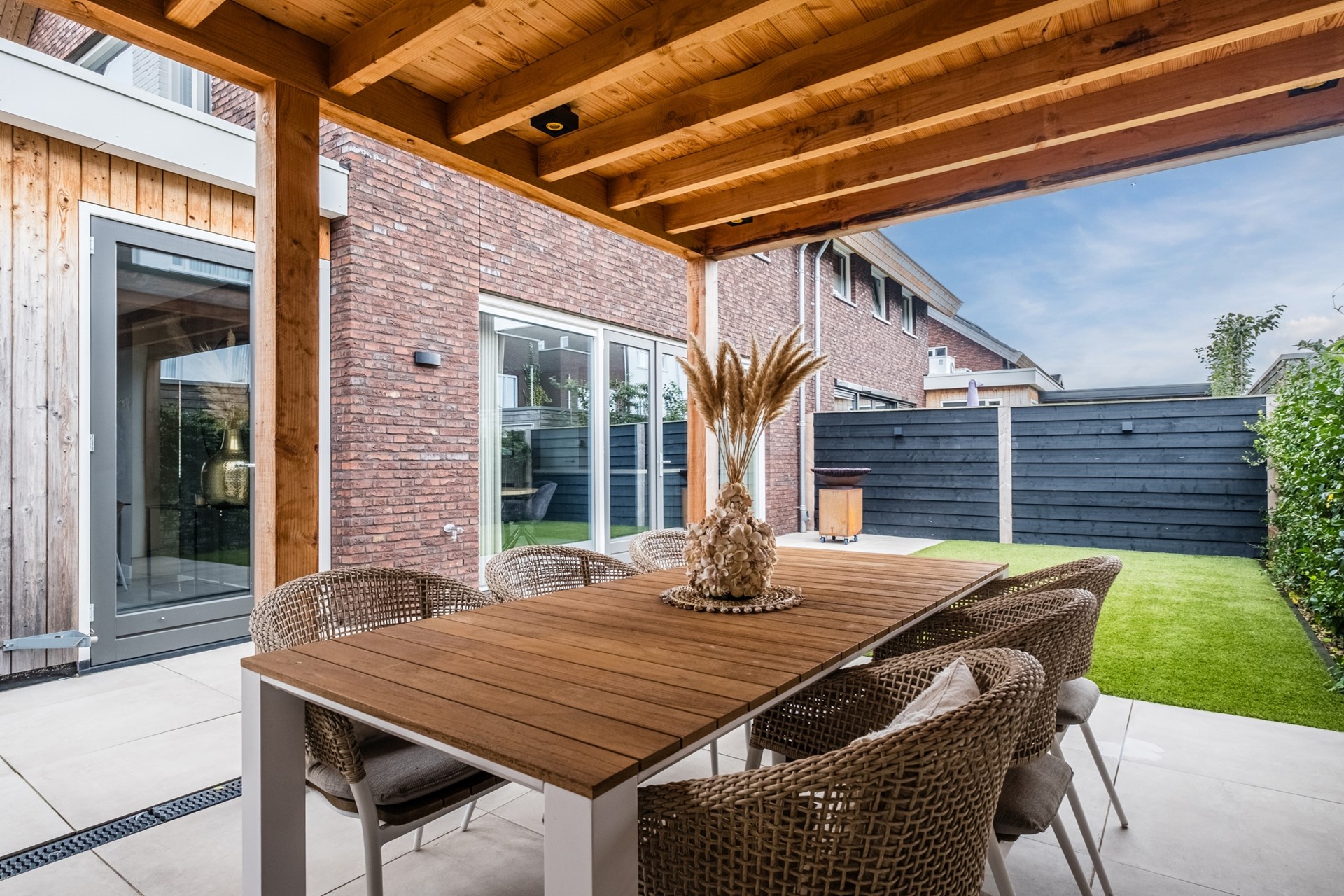 De achtertuin is onderhoudsvriendelijk aangelegd en voorzien van een luxe overkapping. Daarnaast is er een compacte berging aanwezig voor fietsen en/of tuingereedschap. De tuin is bovendien via twee achteringangen bereikbaar, wat zorgt voor extra gemak.