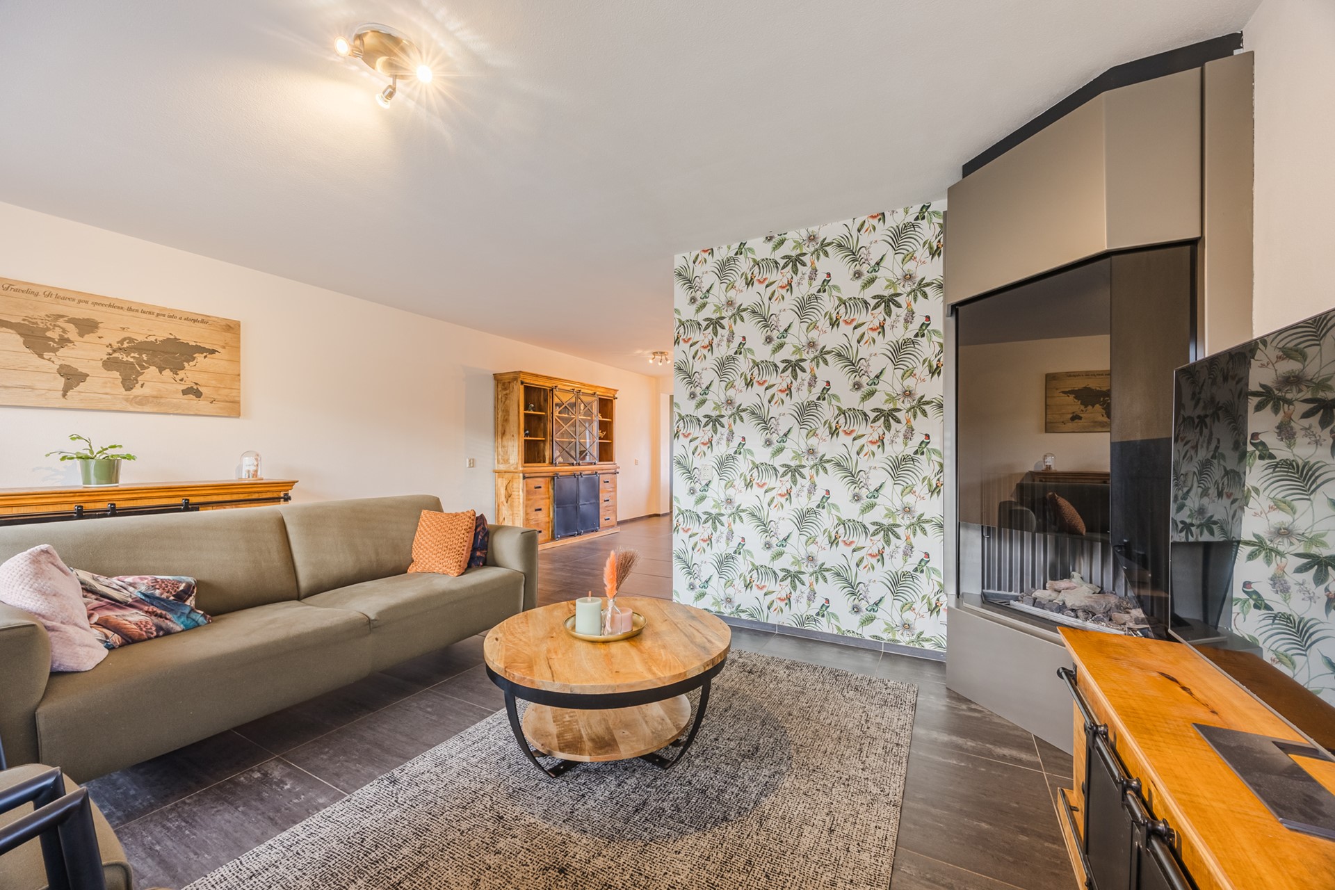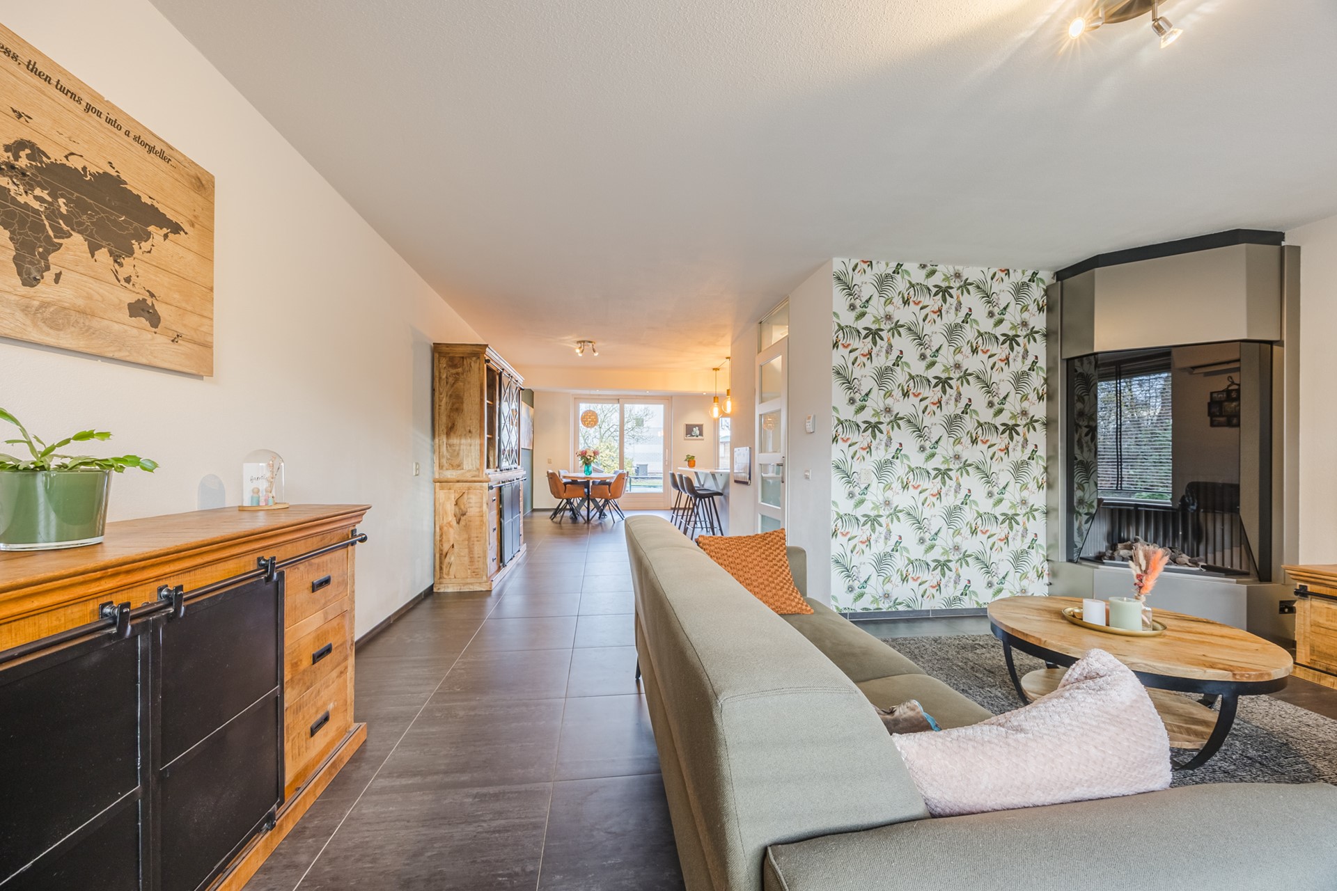 Overdekte entree met hal, meterkast en modern toilet. De royale woonkamer is voorzien van een tegelvloer met vloerverwarming, een moderne gashaard en een schuifpui naar het terras. De open keuken is luxe uitgevoerd met een U-vormige opstelling en complete inbouwapparatuur.