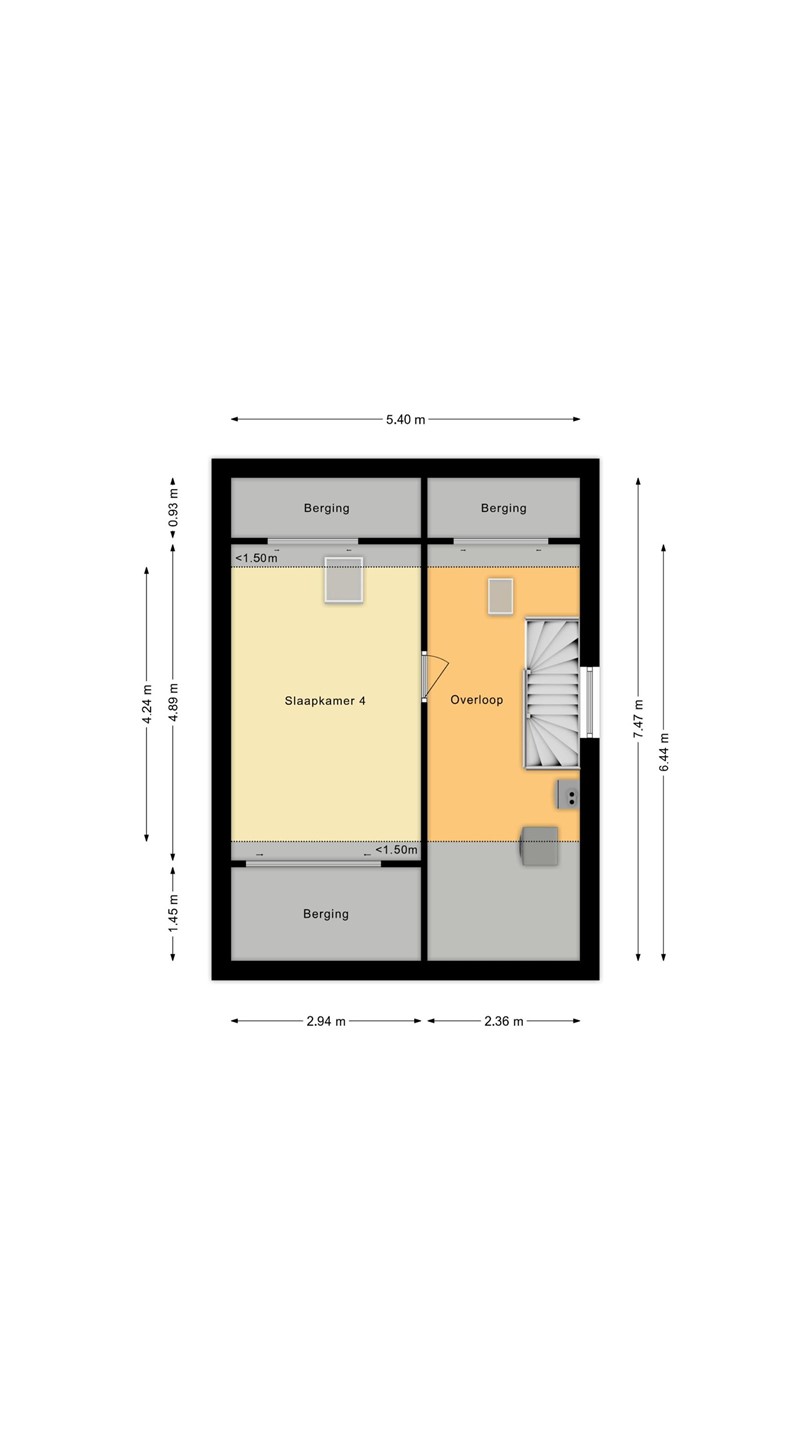 Via vaste trap bereikbaar. Voorzolder met aansluitingen voor was-apparatuur, cv-installatie, mechanische ventilatie en extra bergruimte. Daarnaast een ruime zolderkamer met Velux dakraam en extra bergruimte achter knieschotten.